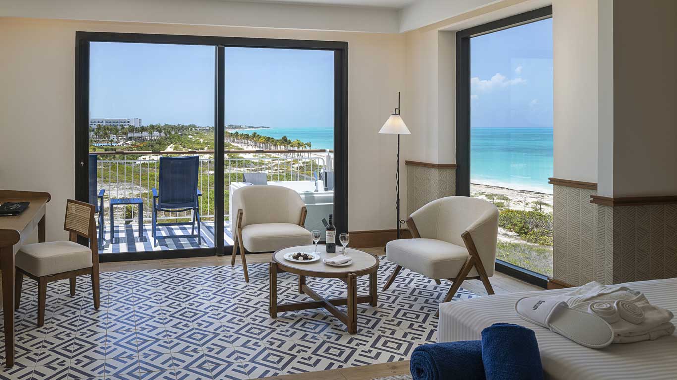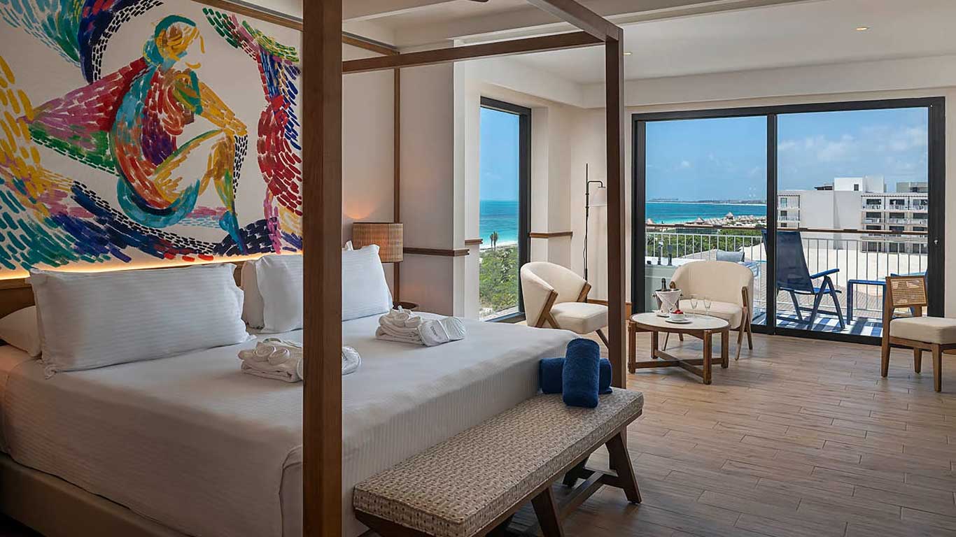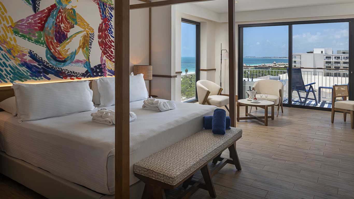 The Ocean Front Master Suite at Ocean Azure Costa Mujeres featuring a bedroom with a king-size bed, a separate lounge with a sofa bed, and a terrace with a jacuzzi where you can enjoy stunning front views of the ocean. By booking this Master Suite, you can enjoy all the Privilege services.